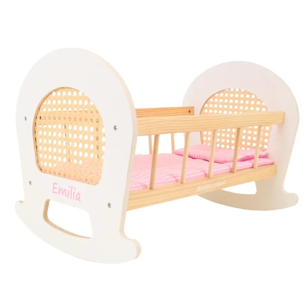 Name sticker pink doll cradle rattan